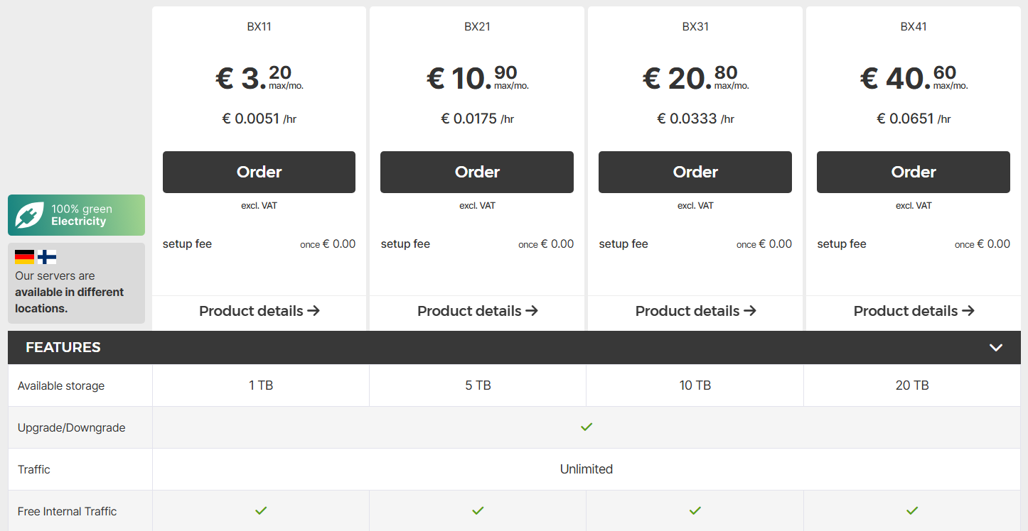| Hetzner Storage Box (BX11) | 1 TB | €3.20 |