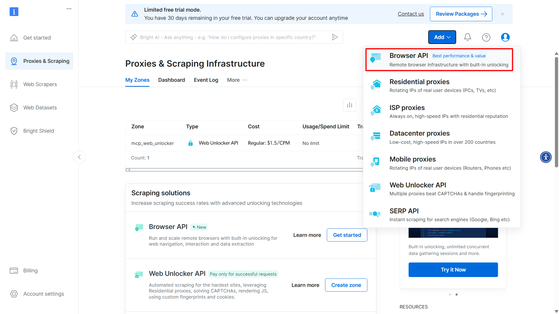 Make sure to make note of the 'Zone name', it will be required for the 'WEB_UNLOCKER_ZONE' environment variable.